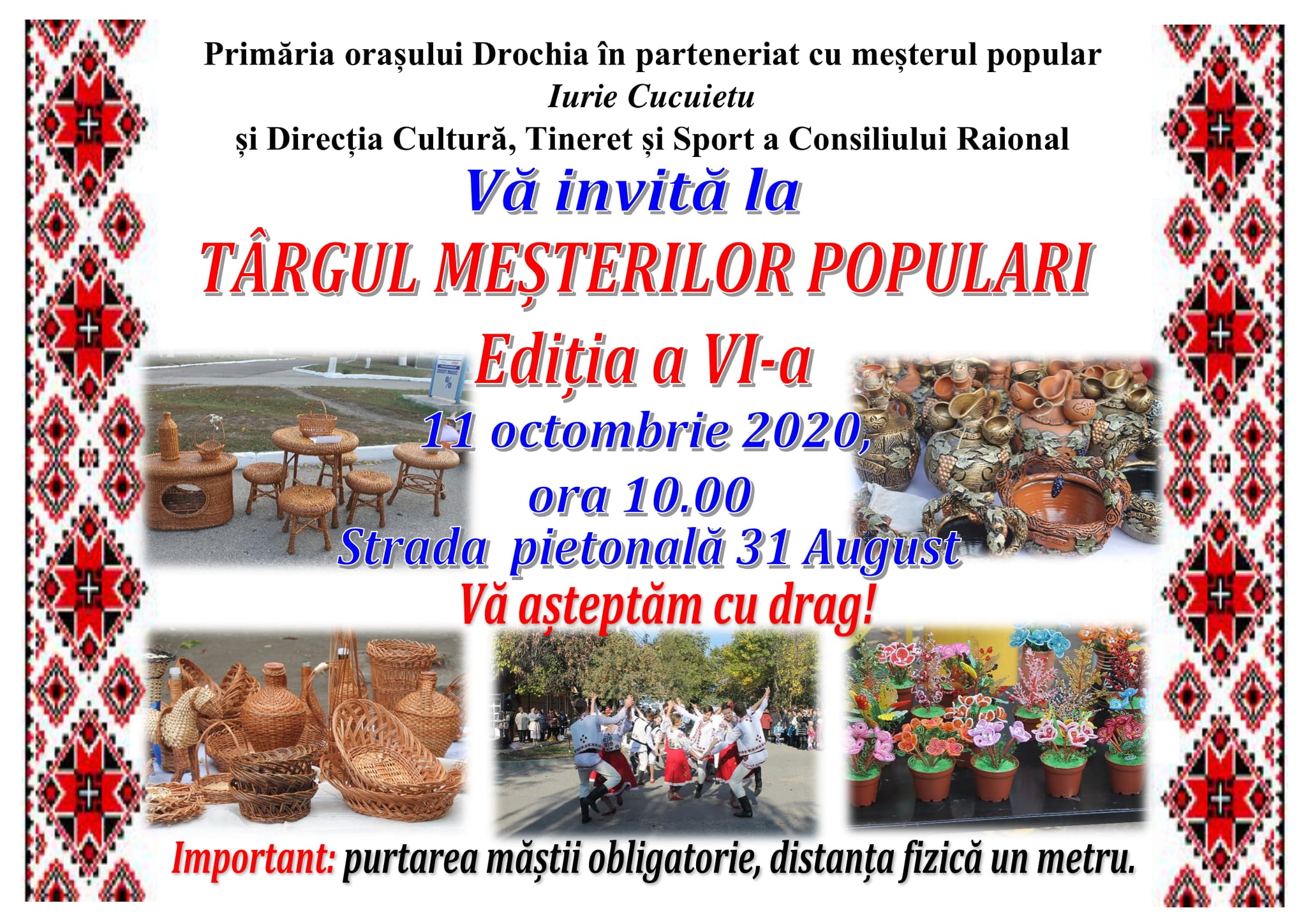 Primăria orașului Drochia în parteneriat cu meșterul popular Iurie Cucuietu și Direcția Cultură, Tineret și Sport a Consiliului Raional Drochia Vă invită la Târgul Meșterilor Populari , Ediția a VI-a, care va avea loc în data de 11 octombrie, curent, pe strada pietonală 31 august.