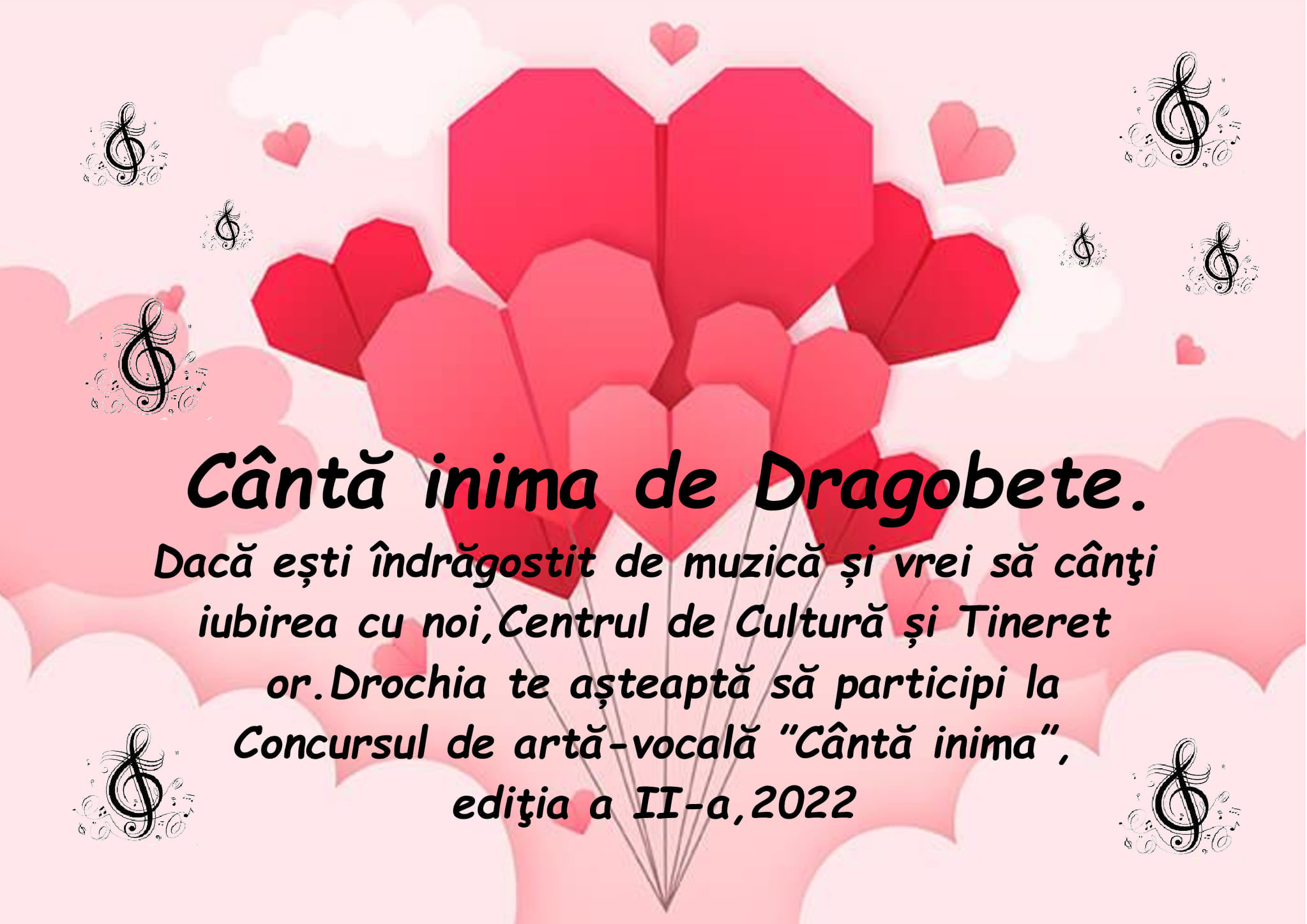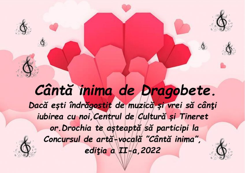 Dacă ești îndrăgostit de muzică și vrei să cânți iubirea cu noi, Primăria orașului Drochia în parteneriat cu Centrul de Cultură și Tineret or.Drochia te așteaptă să participi la Concursul de artă vocală ”Cântă inima”, ediția a II-a , 2022.