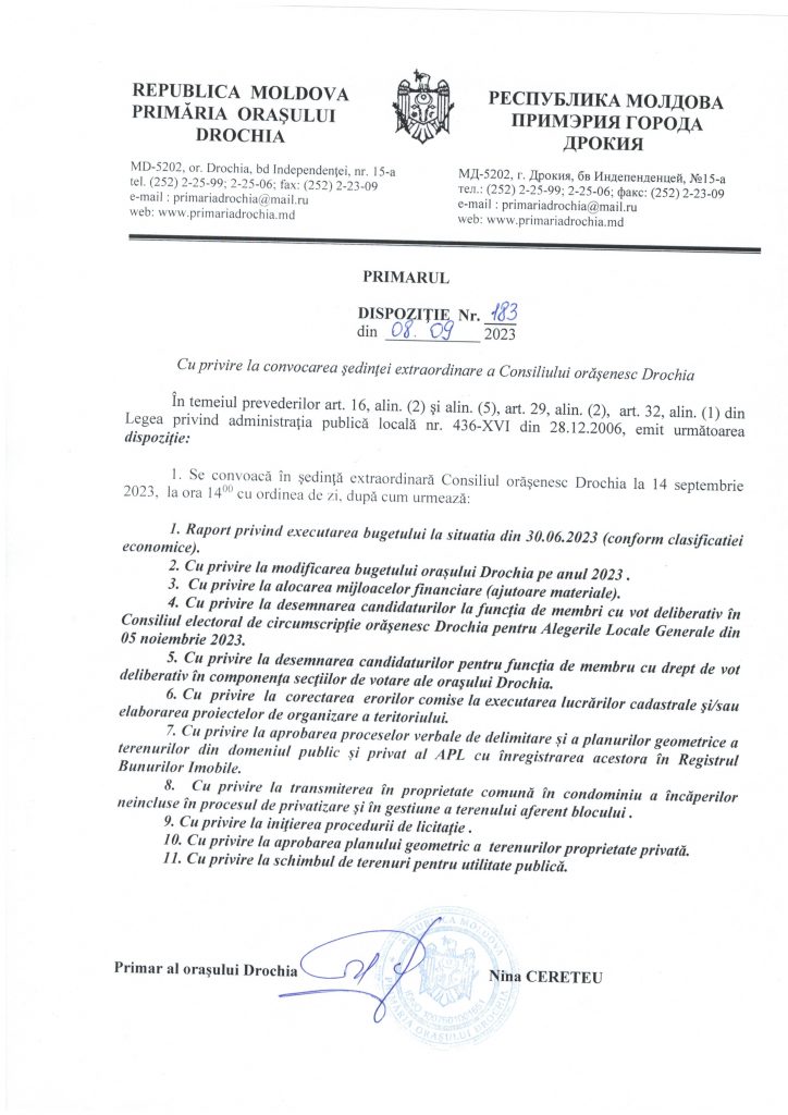 La data de 14 septembrie 2023 Consiliul orășenesc Drochia se convoacă în ședință extraordinară!